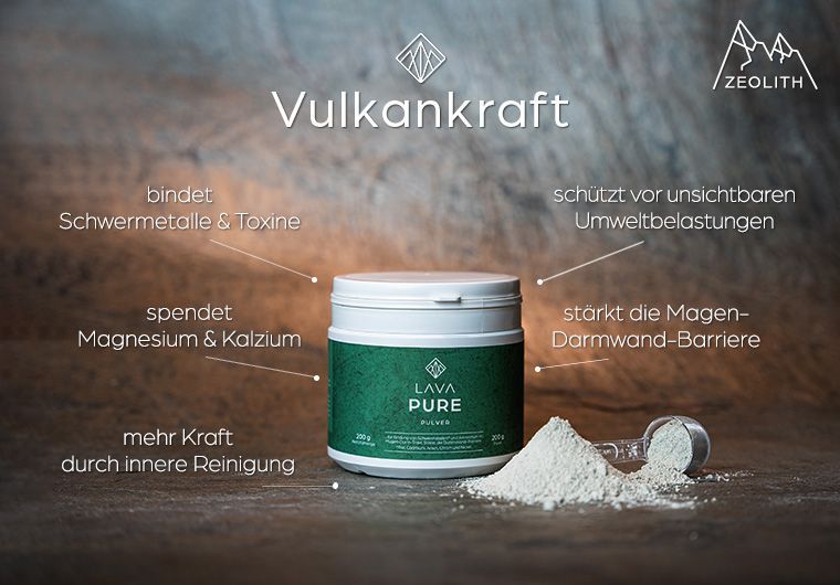 Aufgrund der stetig steigenden Umweltbelastung reichern sich zunehmend mehr Schadstoffe im menschlichen Organismus an. LAVA PURE bindet diese Schadstoffe bereits im Magen-Darm-Trakt, noch bevor sie den Körper schädigen können. Diese präventive Wirkung wurde durch Studien eindrucksvoll bestätigt. Gleichzeitig gibt LAVA PURE wertvolle Mineralien und Spurenelemente an den Organismus ab.